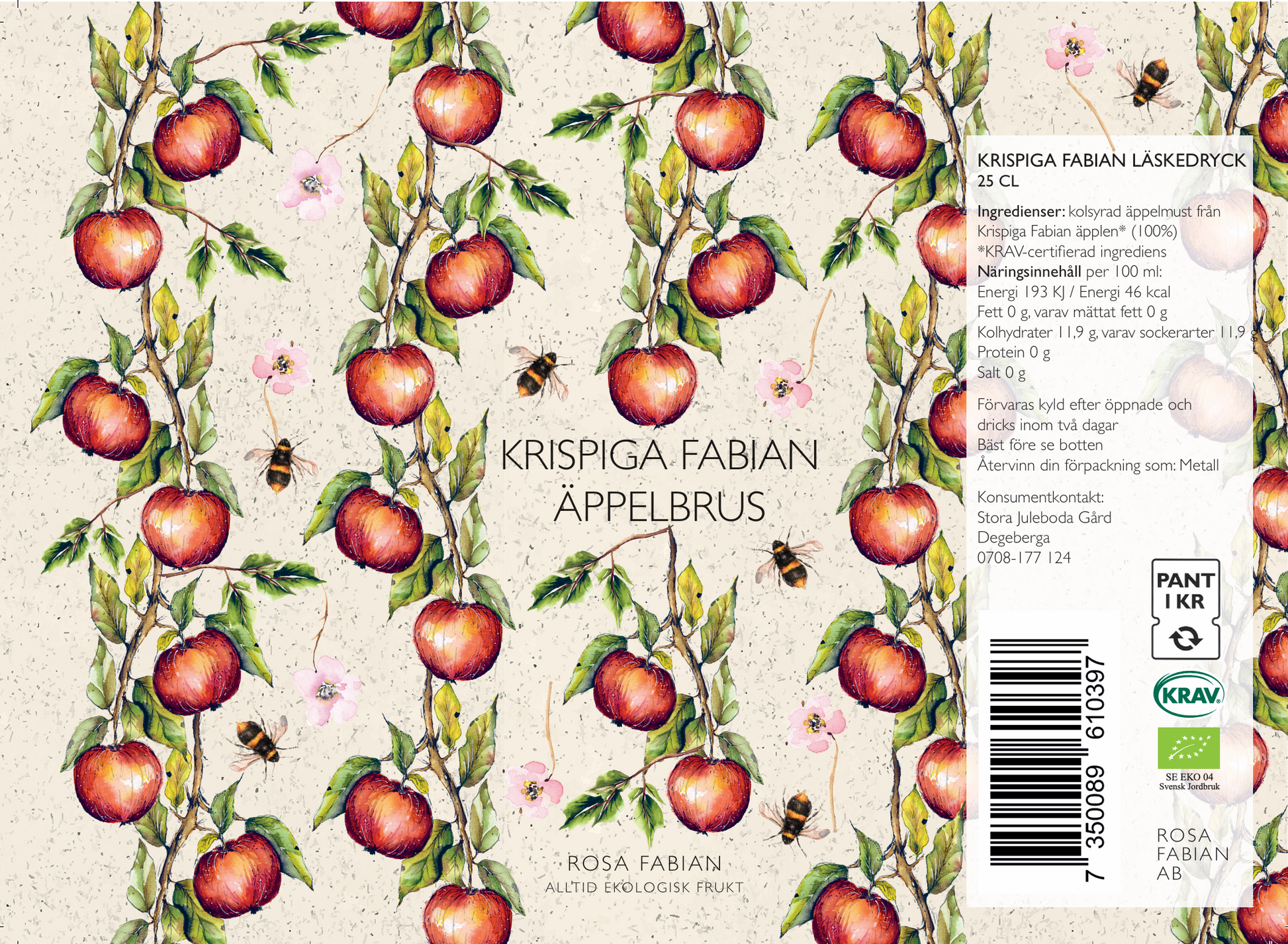 Denna bubblande läskedryck är gjord på must från äppelsorten Krispiga Fabian. Vår äppelmust tillverkas genom att färska ekologiska äpplen pressas och musten är alltid utan tillsatt socker. En must med fruktig och blommig äppelsmak med svag syra. Sällskapsdryck som passar till mellanmål, frukost och fika. Barnens favorit.