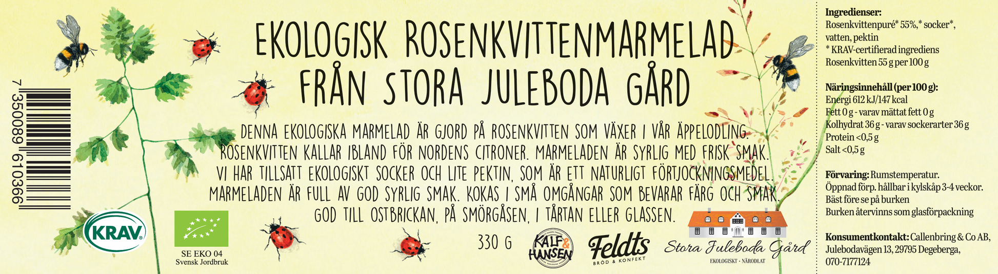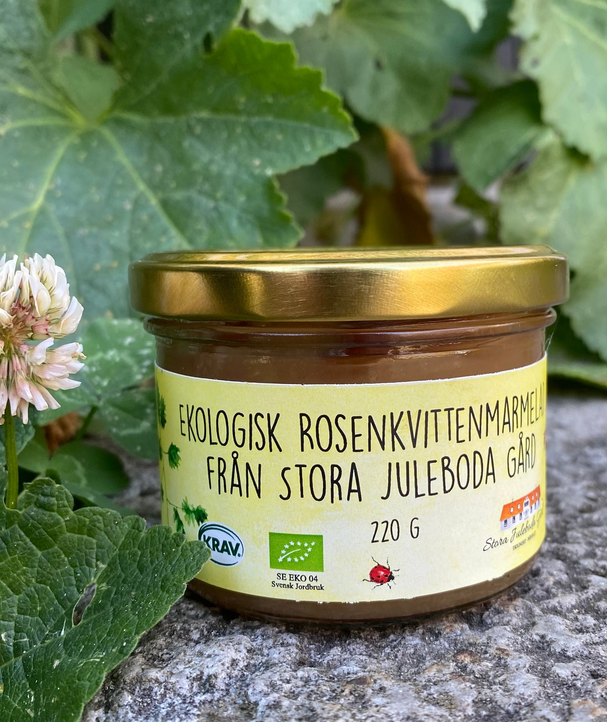 Rosenkvitten plockas för hand från våra buskar. De växer sida vid sida med våra äppelträd. Rosenkvitten ger en härliga syra och brukar kallas nordens citron. Kokas i små mängder för bästa resultat. God på smörgåsen, i bakverk eller i galss. Finns i burkar med 330 g och 220 g.